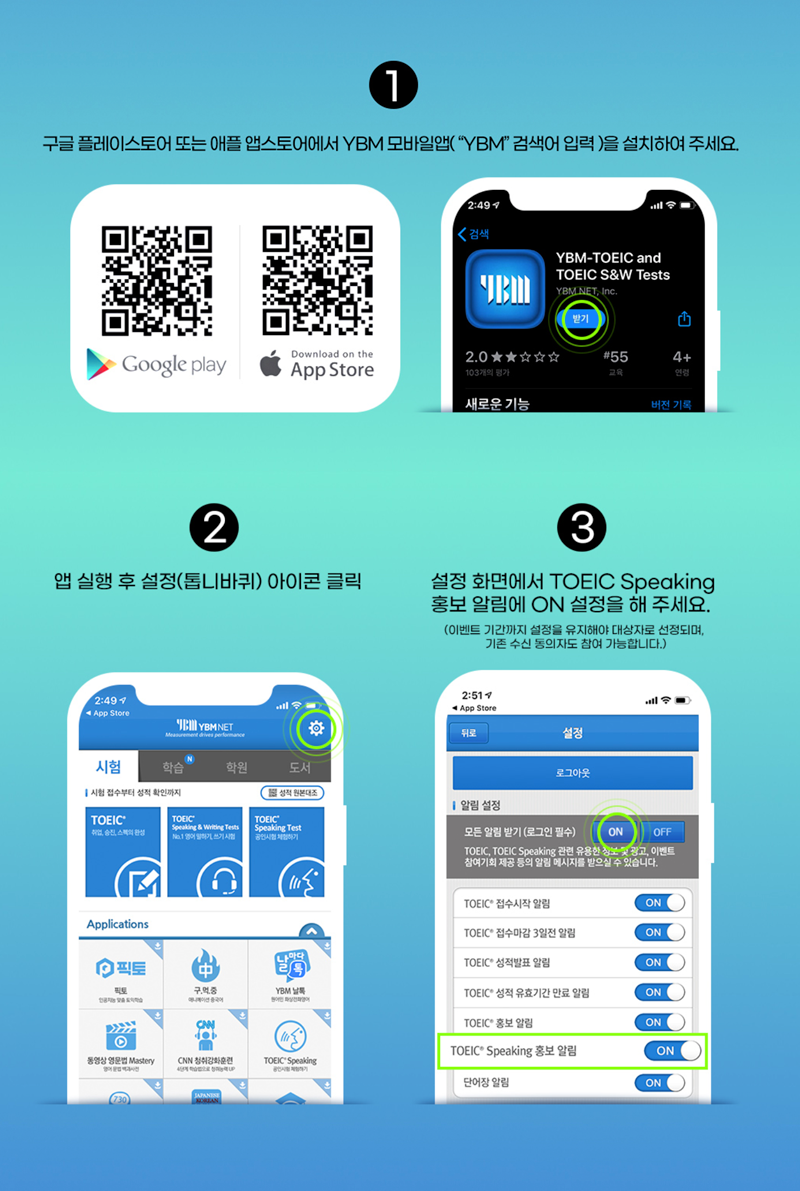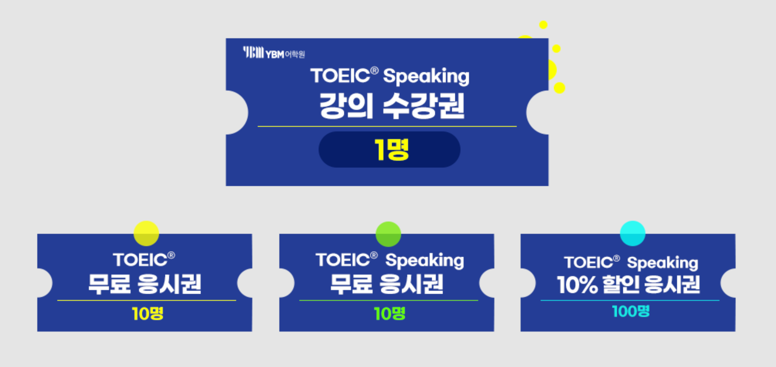 홍보 알림을 ON하고 이벤트 참여를 완료한 분들 중 추첨을 통해 1명에게 'YBM어학원 TOEIC Speaking 강의 수강권'을, 'TOEIC 무료 응시권'과 'TOEIC Speaking 무료 응시권'을 각각 10명에게 드립니다. 'TOEIC Speaking 10% 할인 응시권'도 무려 100명에게 제공할 예정이니 지금 바로 YBM 모바일앱을 다운받으러 GO GO~!
