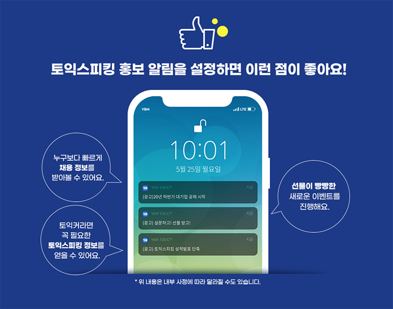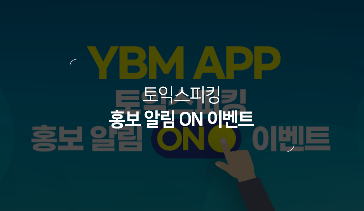 2020년 5월 25일부터 6월 24일까지 1개월간 <토익스피킹 홍보 알림 ON 이벤트>가 진행됩니다. 여러분의 스마트폰에 'YBM 모바일앱'을 설치하고 '홍보 알림'만 켜면 끝! 이제부터 여러분은 채용정보부터 토익스피킹 정보, 그리고 이벤트 정보까지 빠르게 받아볼 수 있습니다. 이번 이벤트에 참여한 분들 중 추첨을 통해 취준생과 토익커에게 꼭 필요한 강의 수강권, 무료 응시권 등을 제공할 예정입니다.