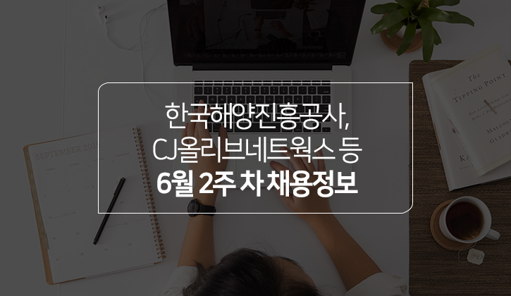 <토익스토리>가 전하는 위클리 채용정보, '6월 2주 차' 채용안내입니다. 한국해양진흥공사, CJ올리브네트웍스, 국민연금공단, 한국수자원공사에서 인턴 및 신입, 경력사원을 모집합니다. 각 채용의 모집 마감일과 토익, 토익스피킹 성적 기준을 알아보도록 하겠습니다.