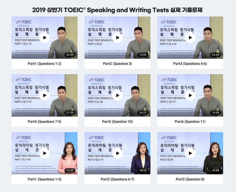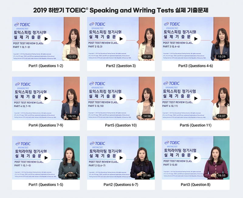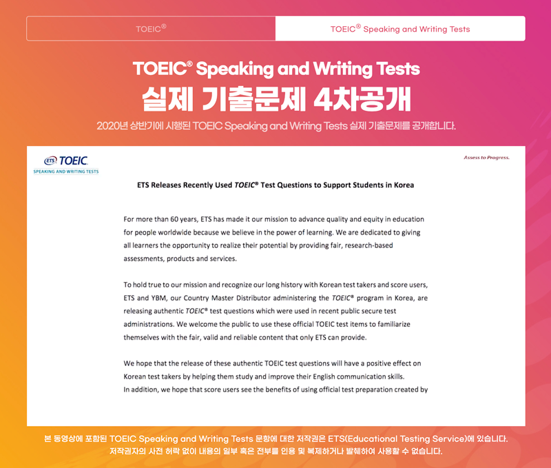 YBM 한국TOEIC위원회는 그동안 TOEIC® Speaking and Writing Tests 출제 기관인 ETS와 협의를 통해 정기시험 실제 기출문제와 수험자 답변을 2018년부터 쭉 공개해 왔는데요. 많은 수험자들이 기다리셨을 2020년 상반기 TOEIC® Speaking and Writing Tests 실제 기출문제를 공개합니다! :) 지금 바로 TOEIC Speaking 홈페이지 (http://www.toeicspeaking.co.kr)에서 확인하실 수 있습니다.