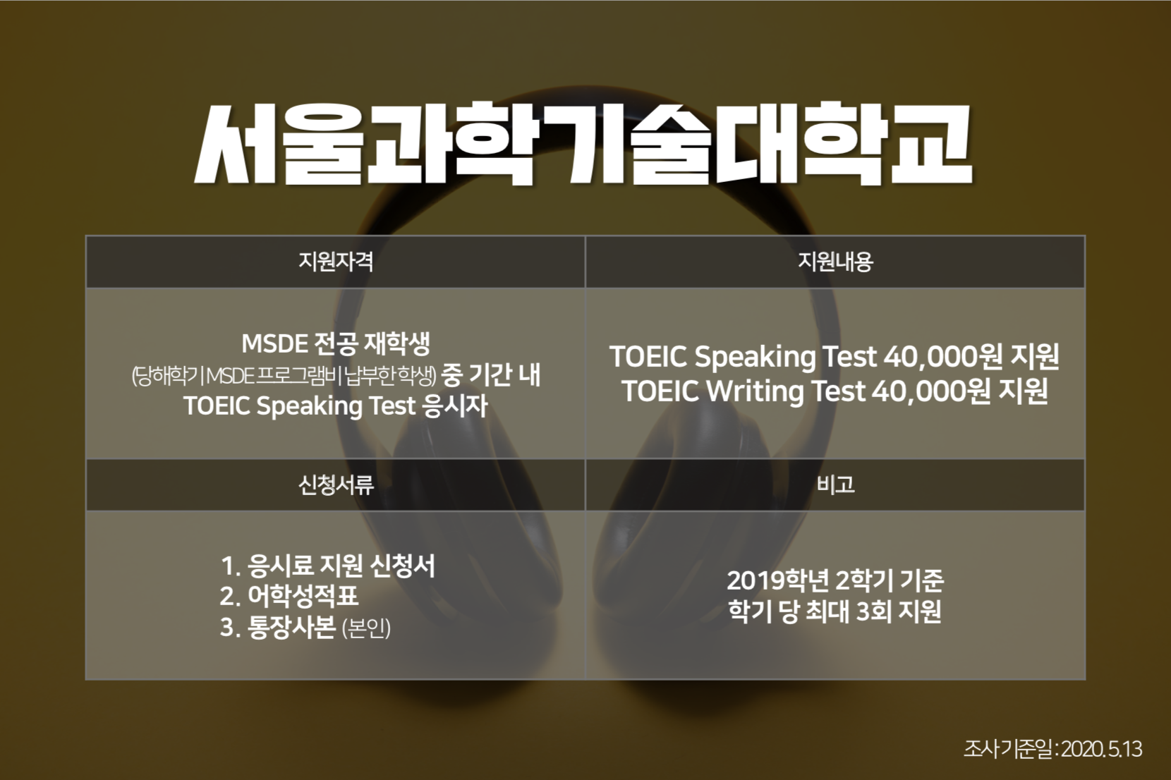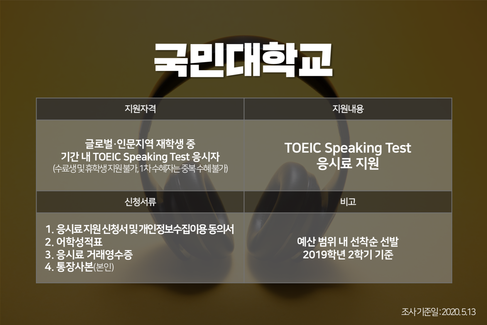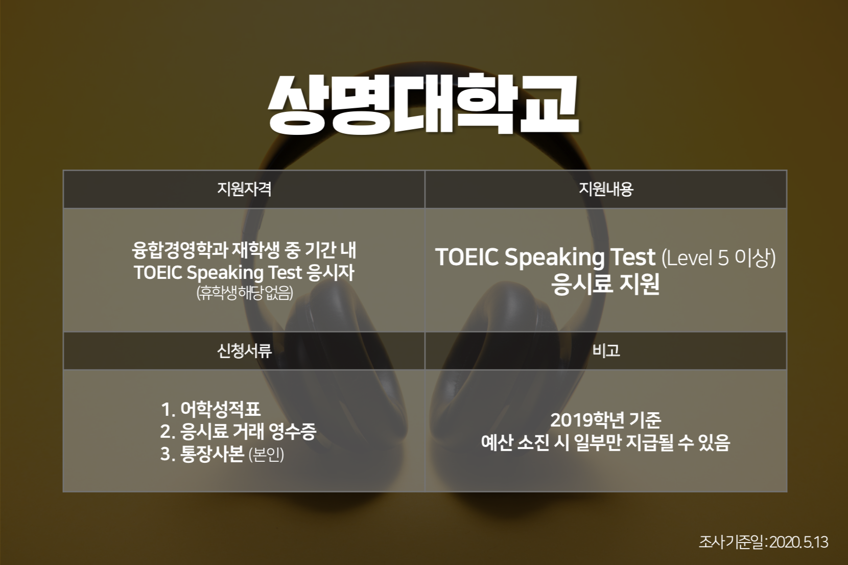 취업을 위해 토익스피킹 시험을 준비 중이신가요? 그렇다면 지금 여러분이 재학 중인 대학교에서 토익스피킹 응시료를 지원하고 있는지 확인해 보세요. 학교별 응시료를 지원받을 수 있는 성적기준과 지원 금액, 지원에 필요한 신청서류 등 <토익스토리>가 한눈에 볼 수 있도록 정리해 봤습니다. :) 응시료 부담 덜고 토익스피킹 성적 취득하는 법, 함께 보실까요?