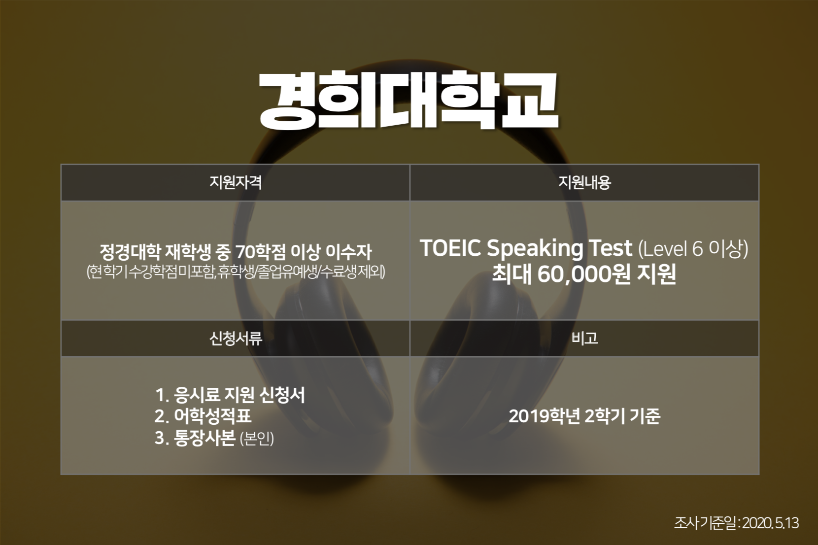 취업을 위해 토익스피킹 시험을 준비 중이신가요? 그렇다면 지금 여러분이 재학 중인 대학교에서 토익스피킹 응시료를 지원하고 있는지 확인해 보세요. 학교별 응시료를 지원받을 수 있는 성적기준과 지원 금액, 지원에 필요한 신청서류 등 <토익스토리>가 한눈에 볼 수 있도록 정리해 봤습니다. :) 응시료 부담 덜고 토익스피킹 성적 취득하는 법, 함께 보실까요?