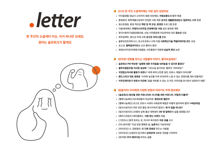 오렌지레터(.letter)는 디자인, 마케팅, 사회적기업 등을 운영하는 '슬로워크'라는 기업에서 큐레이팅하는 뉴스레터입니다. 매주 월요일에 발행하는 오렌지레터는 한 주간의 기관, 기업의 이슈부터 기업인 인터뷰, 채용 소식 등을 제공하고 있어요.