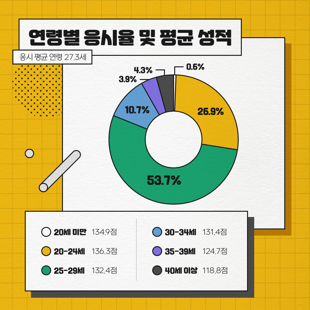 연령별 응시율과 평균 성적은 어떨까요? 25~29세 응시자가 전체의 53.7%로 연령별 응시율 1위를 차지했습니다. 20~24세(26.9%)가 두 번째로 높았고 30~34세(10.7%), 40세 이상(4.3%) 순으로 이어졌는데요. 그런가 하면 평균 성적이 가장 높은 연령은 20~24세로 평균 136.3점을 취득했습니다. 이어 20세 미만이 134.9점(0.6%)으로 2위를 차지했고, 25~29세 (132.4점), 30~34세(131.4점), 35~39세(124.7점) 순으로 나타났습니다.