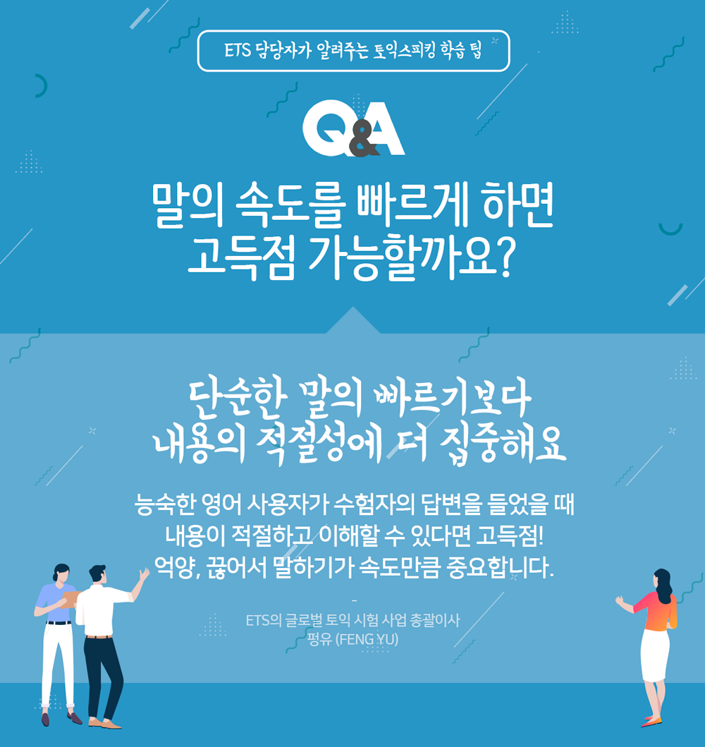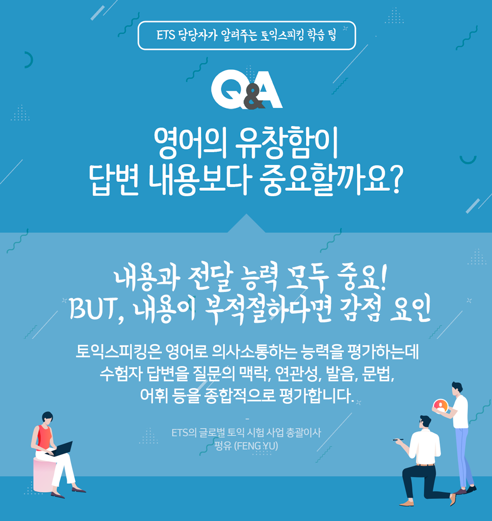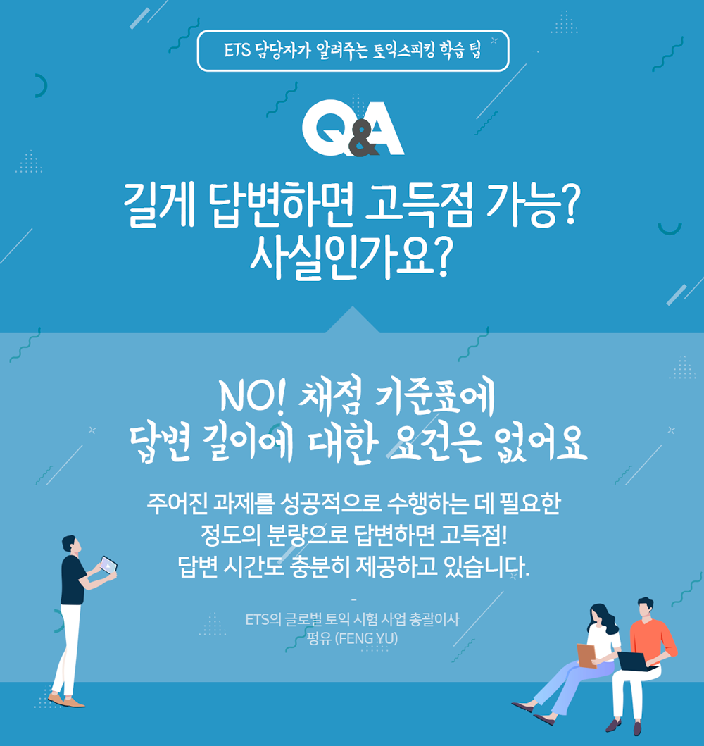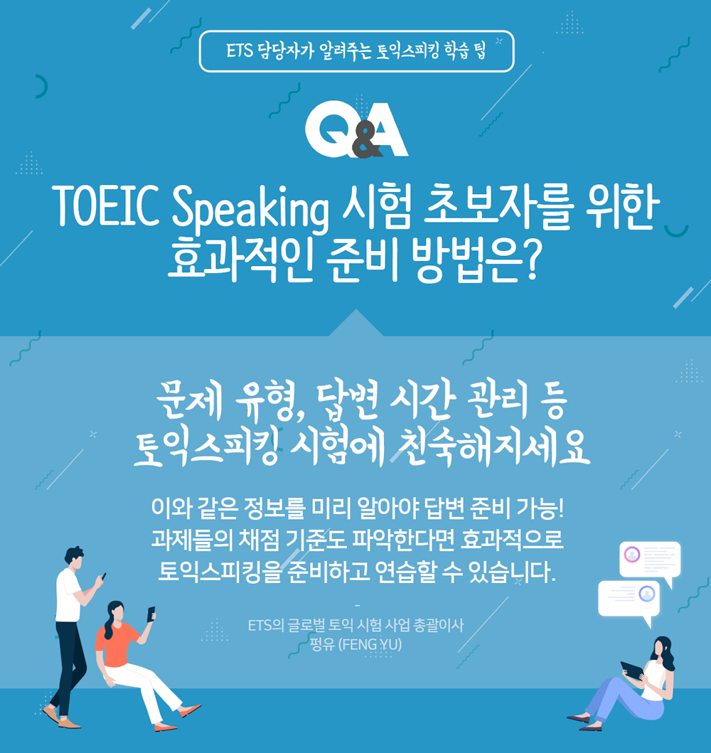 오늘은 <토익스토리>가 그런 어려움을 조금이나마 해소시켜 드리고자, 평소 토익스피킹 학습자가 가장 궁금해 하는 질문을 모아 토익스피킹 출제기관 ETS의 글로벌 토익 시험 총괄이사 펑유(Feng Yu) 박사에게 물었습니다. ETS 담당자가 전하는 토익스피킹 학습 팁, 함께 보실까요?