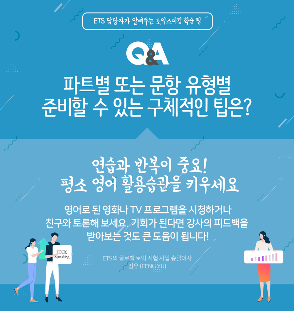 오늘은 <토익스토리>가 그런 어려움을 조금이나마 해소시켜 드리고자, 평소 토익스피킹 학습자가 가장 궁금해 하는 질문을 모아 토익스피킹 출제기관 ETS의 글로벌 토익 시험 총괄이사 펑유(Feng Yu) 박사에게 물었습니다. ETS 담당자가 전하는 토익스피킹 학습 팁, 함께 보실까요?