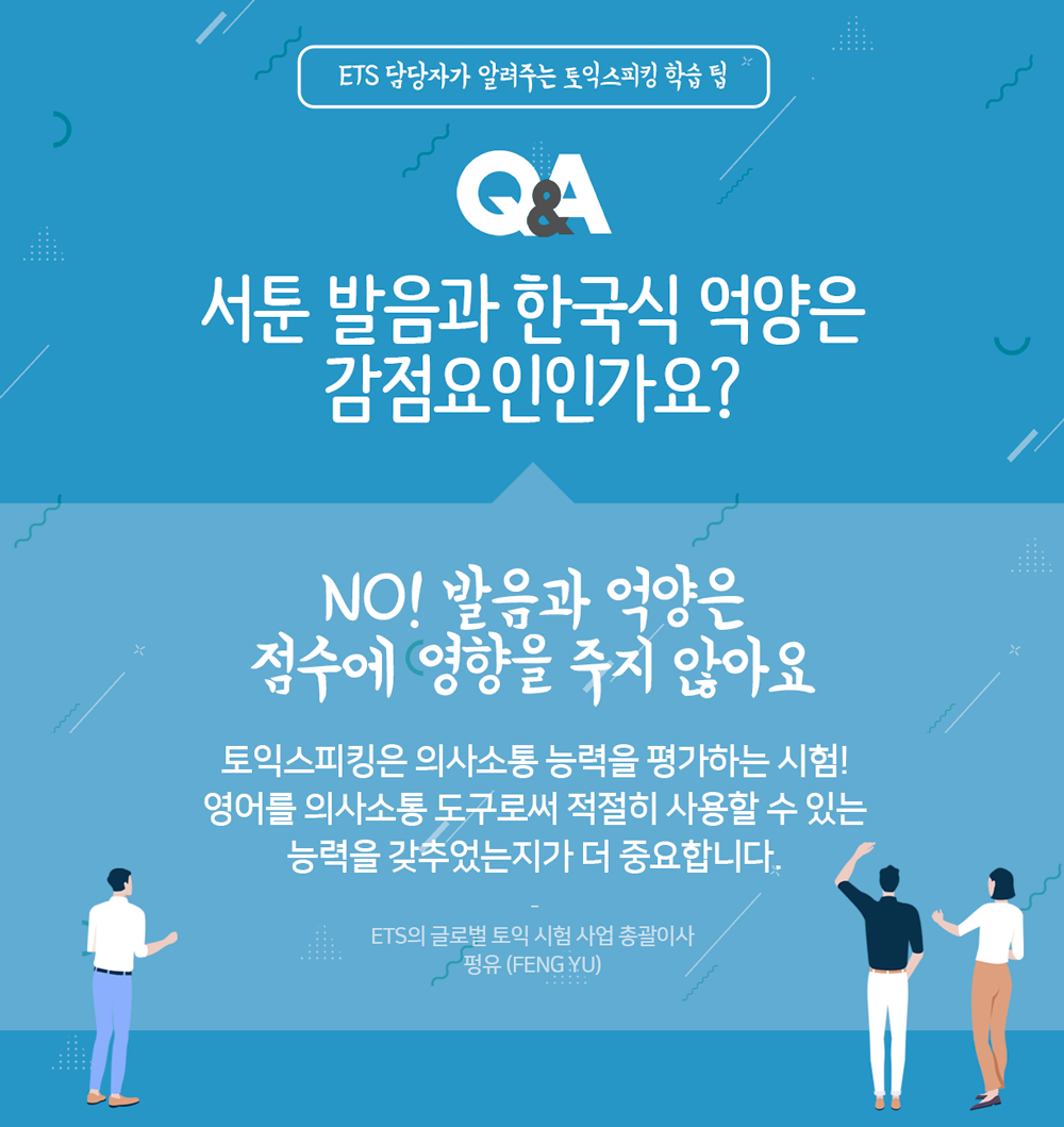 - 한국어 억양이 너무 강해서 능숙한 영어 사용자가 이해를 못 할 정도가 아니라면 ‘발음’과 ‘억양’은 토익스피킹 시험 점수에 영향을 주지 않습니다. 토익스피킹은 의사소통 능력을 평가하는 시험입니다. 주어진 질문을 성공적으로 답변하는 수험자는 업무 환경과 일상생활에서 영어를 의사소통 도구로써 적절하게 사용하는 능력을 갖추고 있음을 의미합니다.
