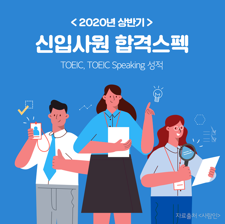 2020년 취업 준비 잘 되어가고 있나요? 계속되는 경기침체와 코로나19의 장기화로 기업의 채용이 눈에 띄게 줄어 취준생에게는 더 힘들었던 2020년 상반기였다고 합니다. 구인구직 매칭 플랫폼 '사람인'에서 <2020 상반기 하반기 신입사원 채용 결산 및 합격 스펙 조사>를 실시하고 최근 그 결과를 공개했는데요. 구직난을 극복한 신입사원들의 토익, 토익스피킹 성적을 함께 알아보겠습니다.