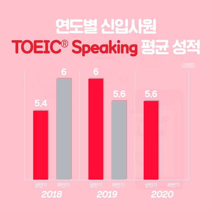 토익스피킹 평균 성적은 2019년 하반기와 동일한 레벨5.6을 유지했습니다. 지난 2020년 상반기 채용공고를 살펴보면 한국도로공사, 한국수자원공사, 삼성전자, LG전자, LS산전, 포스코케미칼, BGF리테일 등 다수의 기업에서 2020년 상반기 신입사원을 모집하면서 ‘토익스피킹 6레벨 이상’에 준하는 영어 성적을 요구한 바 있는데요. 토익스피킹 준비 시 레벨6 이상의 성적을 목표로 미리 준비를 하는 것이 높은 취업의 문턱을 넘는데 도움이 될 거라고 예상합니다.