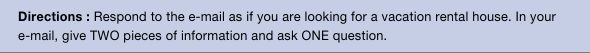 Questions 6~7은 디렉션에서 요구한 사항을 충실하게 반영하는 것이 중요합니다. 특히 수험자가 작성해야하는 부분의 디렉션을 잘 살펴봐야 하는데요. 흔히 범하는 실수는 예를 들어, "이메일을 읽고 두 가지 제안과 한 가지 질문을 하라"는 디렉션이 있음에도 '한 가지 제안'만 한다던가, '질문하기'를 놓친다던가 하는 경우가 있습니다. 디렉션을 꼼꼼히 확인 후 답안을 작성하고, 작성 후에도 디렉션에 맞춰 작성이 되었는지 확인하시기 바랍니다.