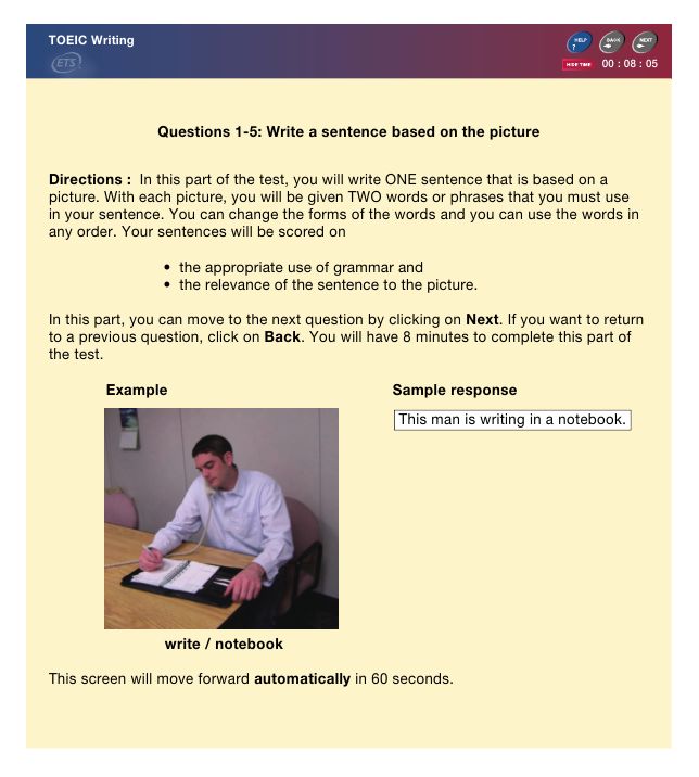 제한 시간 8분 내에 1~5번 문항을 자유롭게 오가며 문제를 풀 수 있습니다. 시험 경험이 있는 수험자의 경우는 이미 알고 있겠지만 처음 응시하는 수험자의 경우 각 문항별 시간을 8분으로 착각해 1번 문제만 답변을 작성하고 나머지 문제에는 답변을 하지 못하고 끝내는 경우가 있습니다. 1~5번 문항 모두를 푸는데 총 8분이 주어진다는 점 잊지마세요!