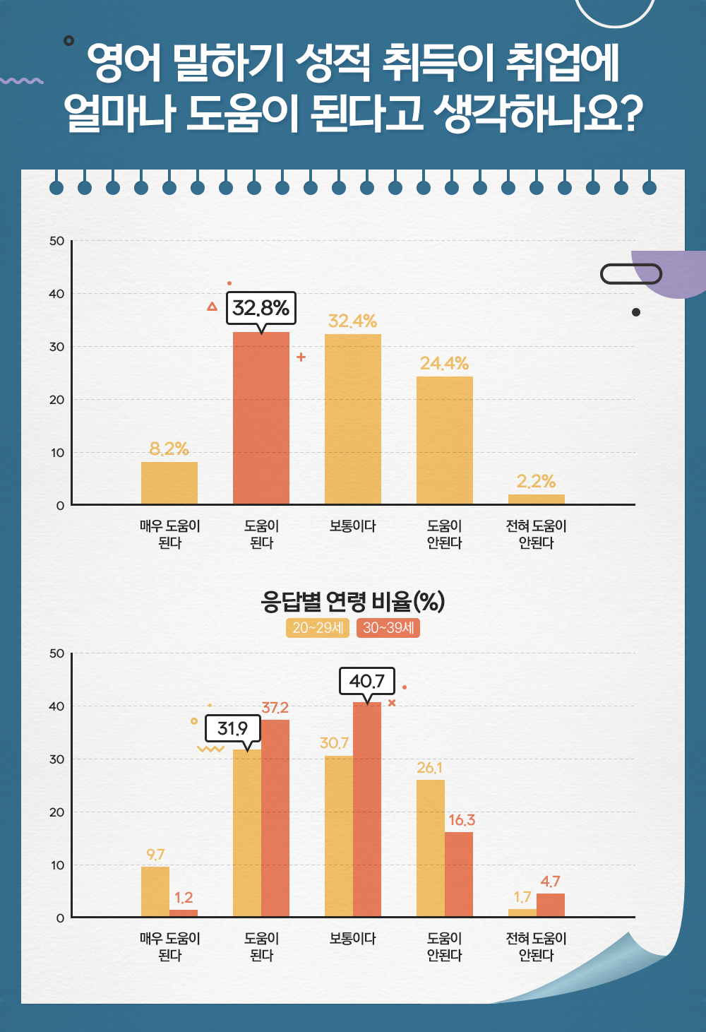 공인 영어 성적 중 '토익스피킹'과 같은 '영어 말하기 성적이 취업에 도움이 되는가?'라고 물었을 때 '매우 도움이 된다'는 답변이 8.2%, '도움이 된다'는 답변이 32.8%로, 도움이 된다는 긍정적인 답변이 전체 41%로 높게 나타났습니다. 실제 직장인을 대상으로 조사한 '직장인 영어 능력 인식조사'에서도 '말하기 능력이 필요하다'라는 의견이 매우 높게 나타났던 것처럼, '영어 말하기'는 취업부터 실무까지 아우르는 필수 스펙이라 해도 과언이 아닐 듯합니다. 연령별 비율을 보면 도움이 된다는 의견이 20~29세, 30~39세 각각 41.6%, 38.4%로 높은 수치를 기록했습니다.