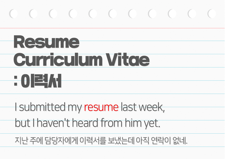 취업 활동의 가장 기본은? 나에 대해 설명하는 '이력서'겠죠! 이력서는 영어로 Resume 또는 Curriculum Vitae, 줄여서 C.V.라고 표현합니다. 조금 더 자세히 이야기하면 Resume과 C.V. 는 성격이 좀 다른데요.