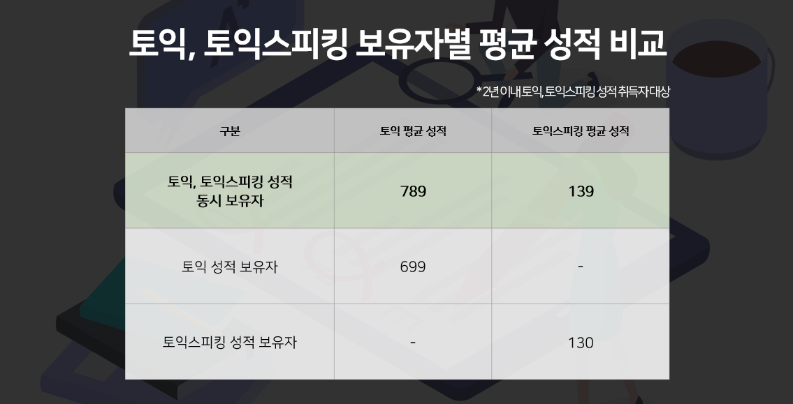 최근 2년 이내의 토익, 토익스피킹 성적을 동시 보유한 사람은 토익 평균점수가 789점으로 나타난 반면 토익 성적만 보유했을 경우 90점 낮은 699점으로 조사되었습니다. 토익스피킹에서도 마찬가지로 동시 보유자의 토익스피킹 성적은 139점, 토익스피킹 성적만 보유한 사람의 성적은 9점 낮은 130점으로 나타났습니다.