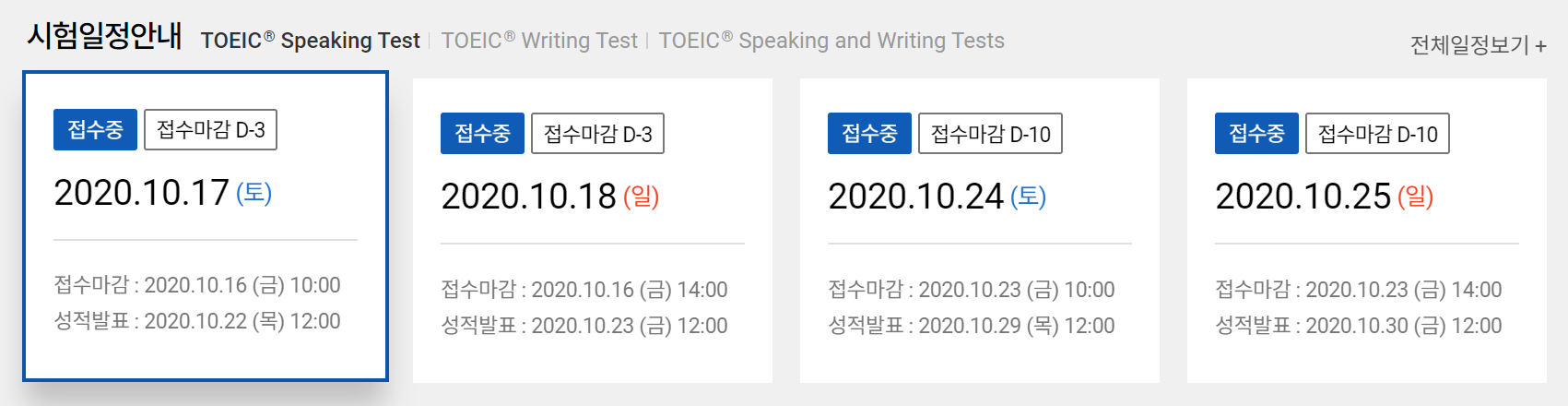 지난 주에 응시했던 토익스피킹 성적이 만족스럽지 않고... 곧 열리는 관심기업의 하반기 공채에 제출하기 위해 영어 말하기 성적을 준비하거나 또는, 조금 더 만족스러운 점수가 필요하다면? 매주 2회씩 진행하는 토익스피킹 시험에 응시하면 됩니다.
