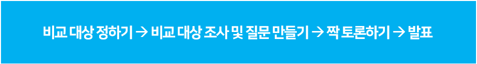 - 비교 하브루타는 두 가지 비교군을 정해서 그 대상을 조사하면서 질문을 만들고, 공통점과 차이점에 대해 서로의 생각을 알아가는 과정을 담고 있습니다.