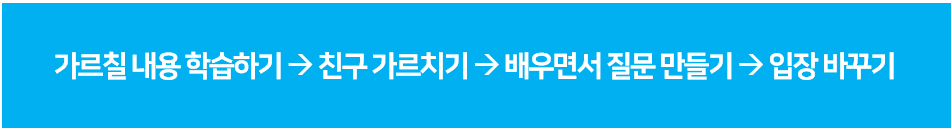 - 친구 가르치기는 서로 가르치고 배울 범위를 정해 각자가 학습한 후 자기가 공부한 내용을 상대방에게 가르치는 방법입니다. 당연히 질문을 받기 때문에 답변을 위해 철저한 준비 해야 하고, 자기가 생각하지 못했던 새로운 시야에서의 질문은 서로에게 시너지(synergy)를 내는 학습으로 유도합니다.