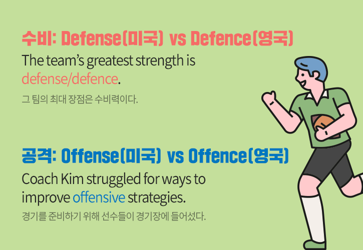 한편, -se, -ce 접미사의 차이로 인해 미국에서는 수비, 공격을 각각 ‘defense’, ‘offense’라고 표기하는 반면, 영국에서는 ‘defence’, ‘offence’로 표기합니다. 다만, 해당 단어의 형용사형의 경우 미국과 영국 모두 ‘defensive’나 ‘offensive’로 표기하고 ‘defencive’, ‘offencive’ 등으로 표기하지 않음을 유의해 주세요!
