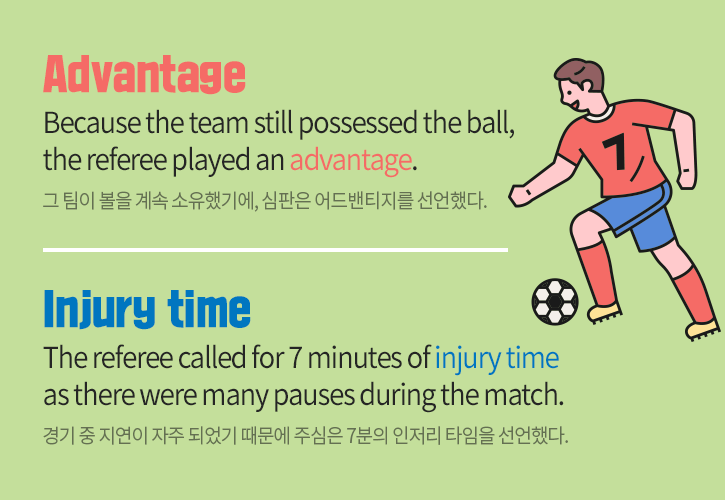 축구 용어에서 ‘advantage’는 파울을 당한 팀이 볼을 계속 소유하고 있을 때, 주심의 재량 하에 경기를 계속 진행시키는 상황입니다. 파울을 당한 쪽이 경기 중단으로 손해를 보지 않고 최대한 이득을 볼 수 있게 한다는 의미에서 ‘advantage’라는 용어를 사용했습니다. ‘Injury time’은 경기 중에 지연으로 인해 정규 경기시간이 끝난 후에도 추가적인 시간을 부여하는 것을 의미합니다. 부상(injury)으로 인한 지연이 많아서 이런 표현이 붙었죠.