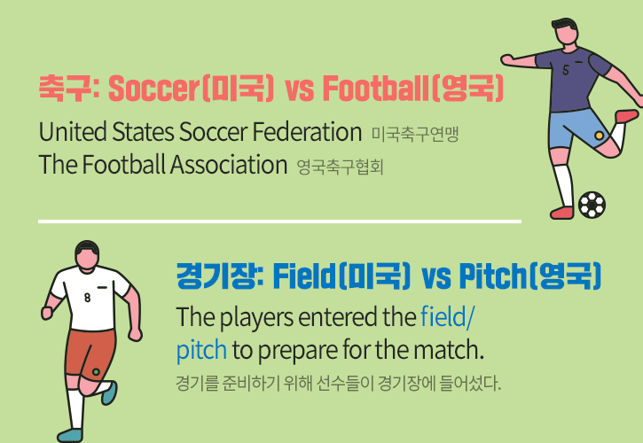 우리가 흔히 아는 축구는 미국에서는 ‘soccer’라고 부르는 반면, 영국에서는 ‘football’ 이라고 부릅니다. 이는 미국에서 ‘football’은 미식축구를 의미하는 단어로 쓰이기 때문입니다. 이 때문에 각국의 축구협회 명칭도 United States Soccer Federation(미국), The Football Association(영국)으로 차이가 있죠. ‘경기장’ 안을 뜻하는 단어는 미국식으로는 ‘Field’, 영국식으로는 ‘Pitch’입니다. 물론, 영국에서 미국식 단어를 사용한다고 해서 전혀 알아듣지 못하는 것은 아니겠지만, 그래도 국가에 따라 더 적합한 표현이 있다는 것 정도는 알아두면 좋겠죠?