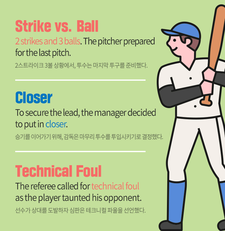 야구 중계에서 ‘strike’, ‘ball’ 용어가 정말 자주 사용되는데요. ‘strike’는 타자가 치기(strike) 좋은 공을, ‘ball’은 일반적인 공을 의미한다는 데에서 유래했습니다. 야구 용어 ‘closer’는 마무리 투수를 지칭하는 것으로, 게임을 끝낸다(close)는 의미에서 온 용어입니다. 농구 용어인 ‘technical foul’은 경기 방해, 폭언 등의 스포츠맨십이 결여된 행위를 했을 때 선언되는 파울입니다. 이는 선수뿐 아니라 코치에게도 적용될 수 있다고 하네요.