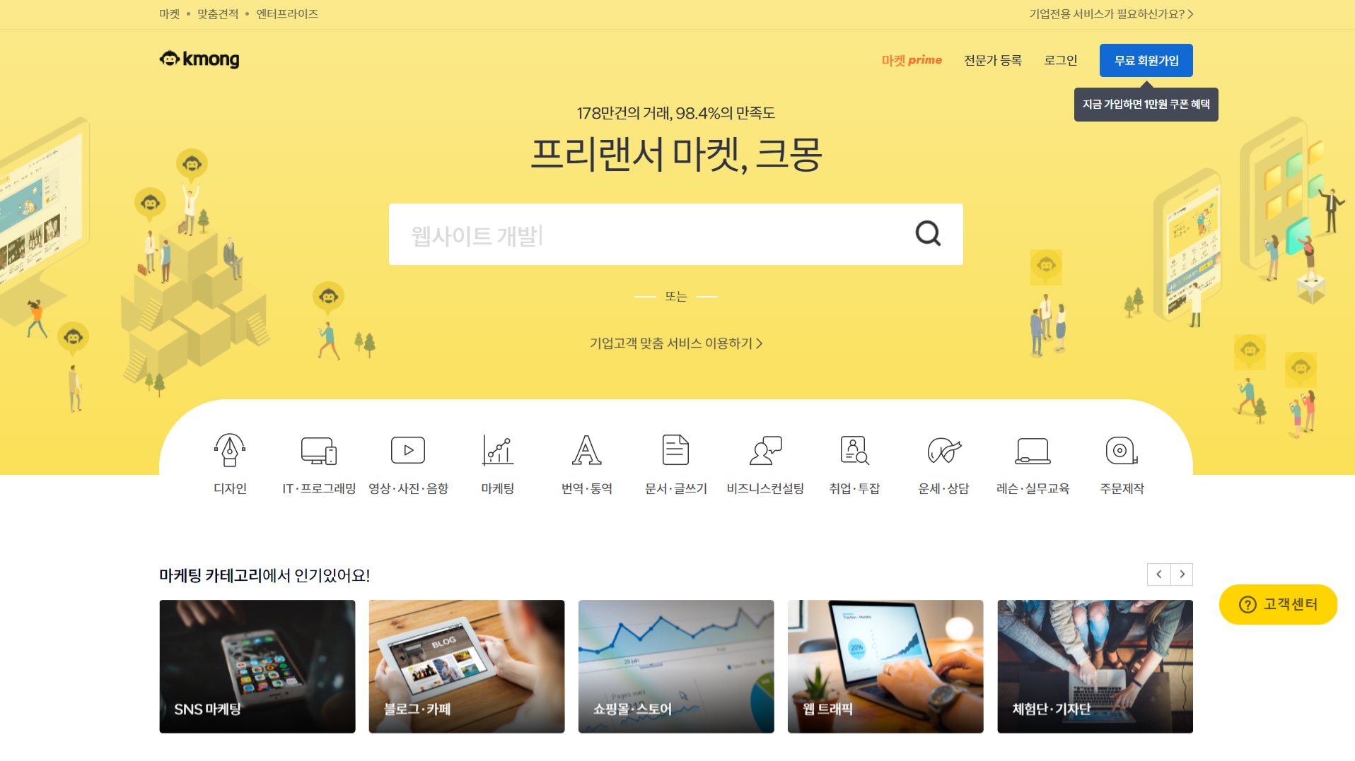 다음은 프리랜서 마켓 ‘크몽’입니다. 수식어에서도 느껴지듯, 크몽은 취미 분야 보단 업무 관련 지식 및 서비스의 거래가 이뤄지는 플랫폼입니다. 디자인, 프로그래밍, 통번역 등 총 11개의 카테고리 내에서, 영세한 사업자 및 기업이 상대적으로 저렴한 가격에 업무를 맡기기 위해 크몽을 사용한다고 합니다.