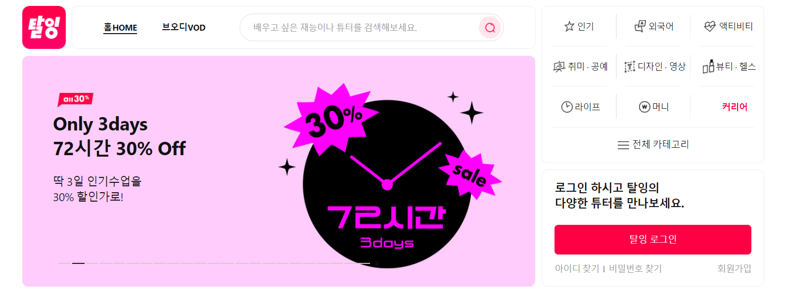 첫 번째는 ‘탈잉’입니다. 잉여탈출의 줄임말인 ‘탈잉’은 ‘누구나 배울 점, 노하우, 재능이 있다’는 아이디어에서 시작됐습니다. 온·오프라인을 합쳐 약 2만 명의 튜터가 활동하며, 150여 개의 강의가 개설됐습니다. 뷰티, 댄스 등 취미의 영역과 재테크, 마케팅, 코딩 등 업무의 영역까지, 다양한 재능이 공유되고 있습니다.