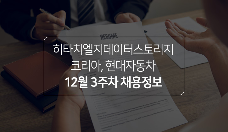 <토익스토리>가 '12월 3주 차' 히타치엘지데이터스토리지코리아, 현대자동차 채용 정보를 안내해 드립니다. 모집 마감일과 토익, 토익스피킹 성적 기준을 확인해 보세요!