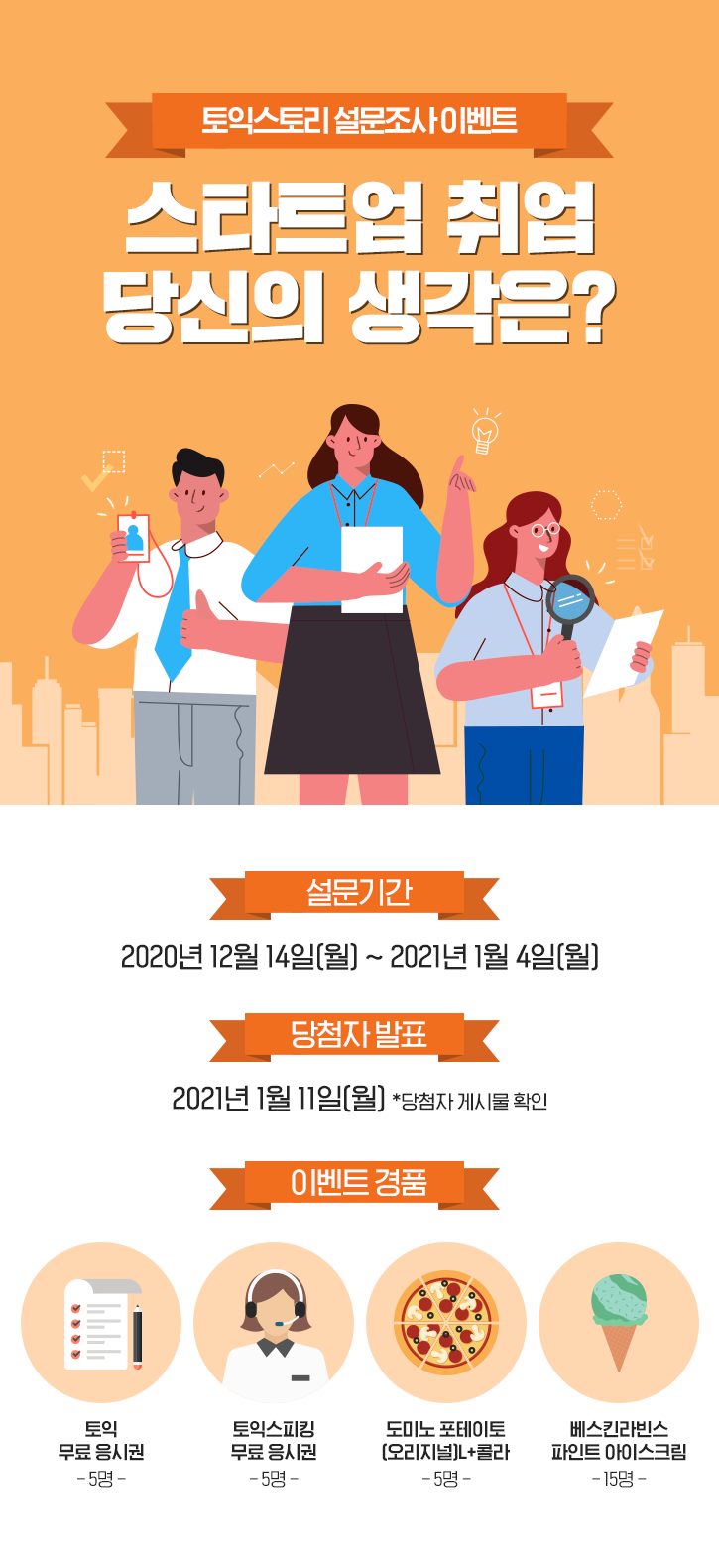 * 설문조사에 참여하면 추첨을 통해 '토익 무료 응시권'(5명), '토익스피킹 무료 응시권'(5명), '도미노 포테이토(오리지널)L+콜라'(15명), '베스킨라빈스 파인트 아이스크림'(15명)를 드립니다.