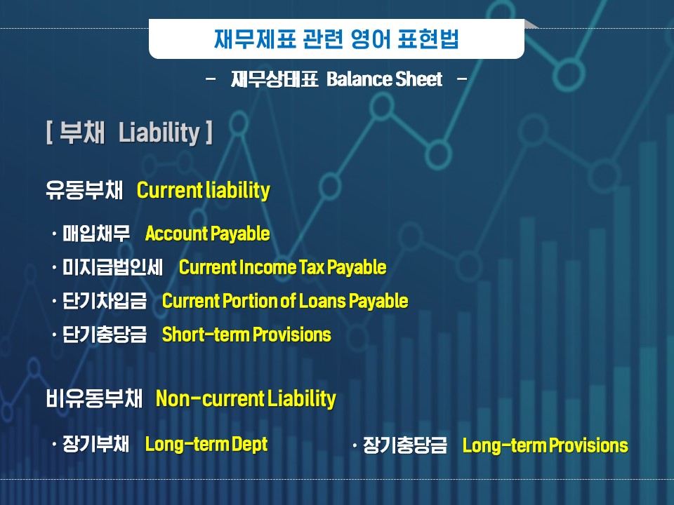 재무상태표에는 복잡하고 어려운 전문 용어들이 정말 많은데요. 한 단어씩 의미를 상기하며 외워두면 유용하게 사용할 수 있을 것 같습니다. :) 예를 들어, ‘통용되는’과 ‘흐름’을 의미하는 ‘Current’에 ‘Non-‘, ‘Liability’ 등을 연계해 의미를 확장시켜 보세요. 참고로 유동부채(Current Liability)/비유동부채(Non-current Liability)와 같이 유동(Current)/비유동(Non-current)을 나누는 이유는 기업 자금의 유통과 리스크 정도를 파악하기 위해서 랍니다. 위험관리 측면에서 재무 상태를 살펴볼 때 꼭 알아두세요!