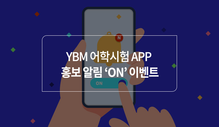 YBM 어학시험 APP 홍보 알림 'ON'이벤트가 1월 13일(수)부터 1월 31일(일)까지 시행됩니다. TOEIC, TOEIC Speaking을 준비하는 취업준비생, 대학생이라면 주목! 채용 정보, 최신 어학 시험 정보를 알려주는 앱이 있다는 사실, 알고 계셨나요? 바로 'YBM 어학시험 APP'입니다. 'YBM 모바일앱'의 홍보 알림을 'ON'을 설정하면 각종 소식을 빠르게 확인할 수 있는데요. 아직 'YBM 어학시험 APP'을 받지 않으셨거나 받았는데 홍보 알림을 켜놓지 않았다면? 지금이 기회입니다. <홍보 알림 ON이벤트>에 참여해 최신 소식과 경품을 동시에 받아 보세요!