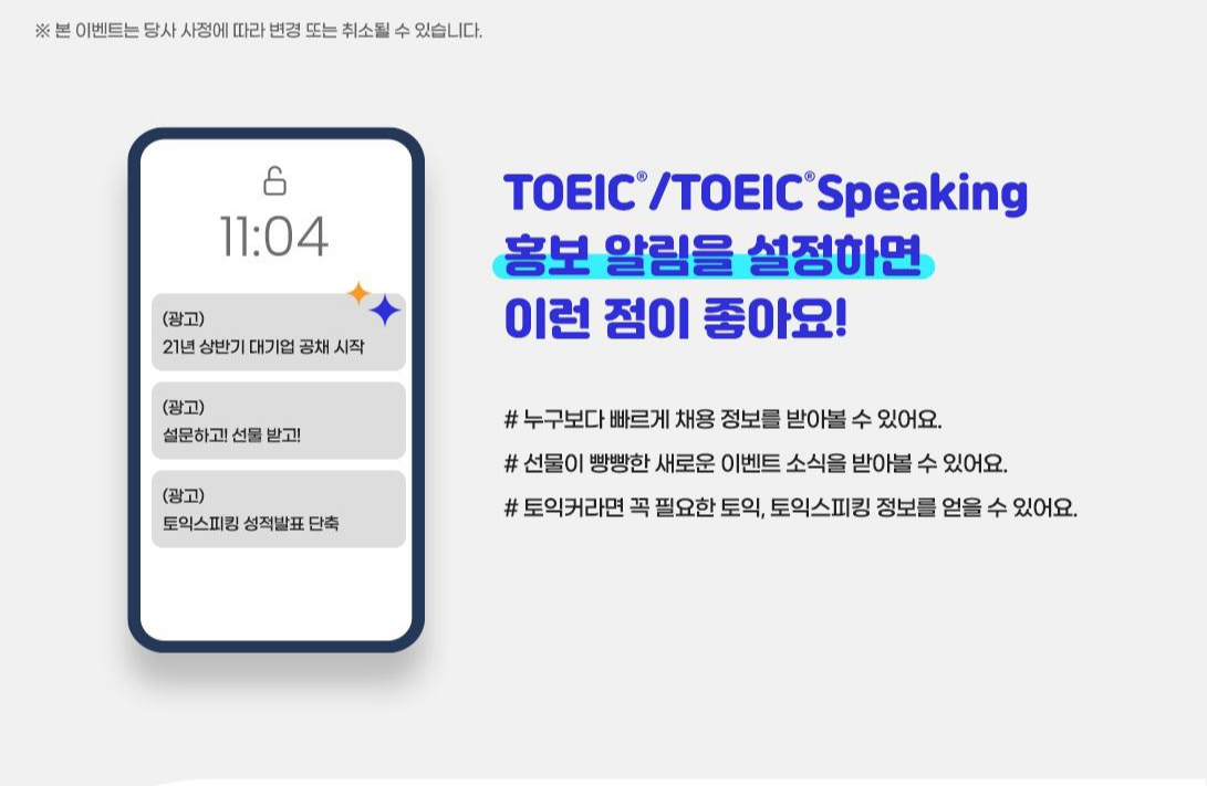 3. 설정 화면에서 TOEIC/TOEIC Speaking 홍보 알림 항목을 'ON'으로 설정한다.