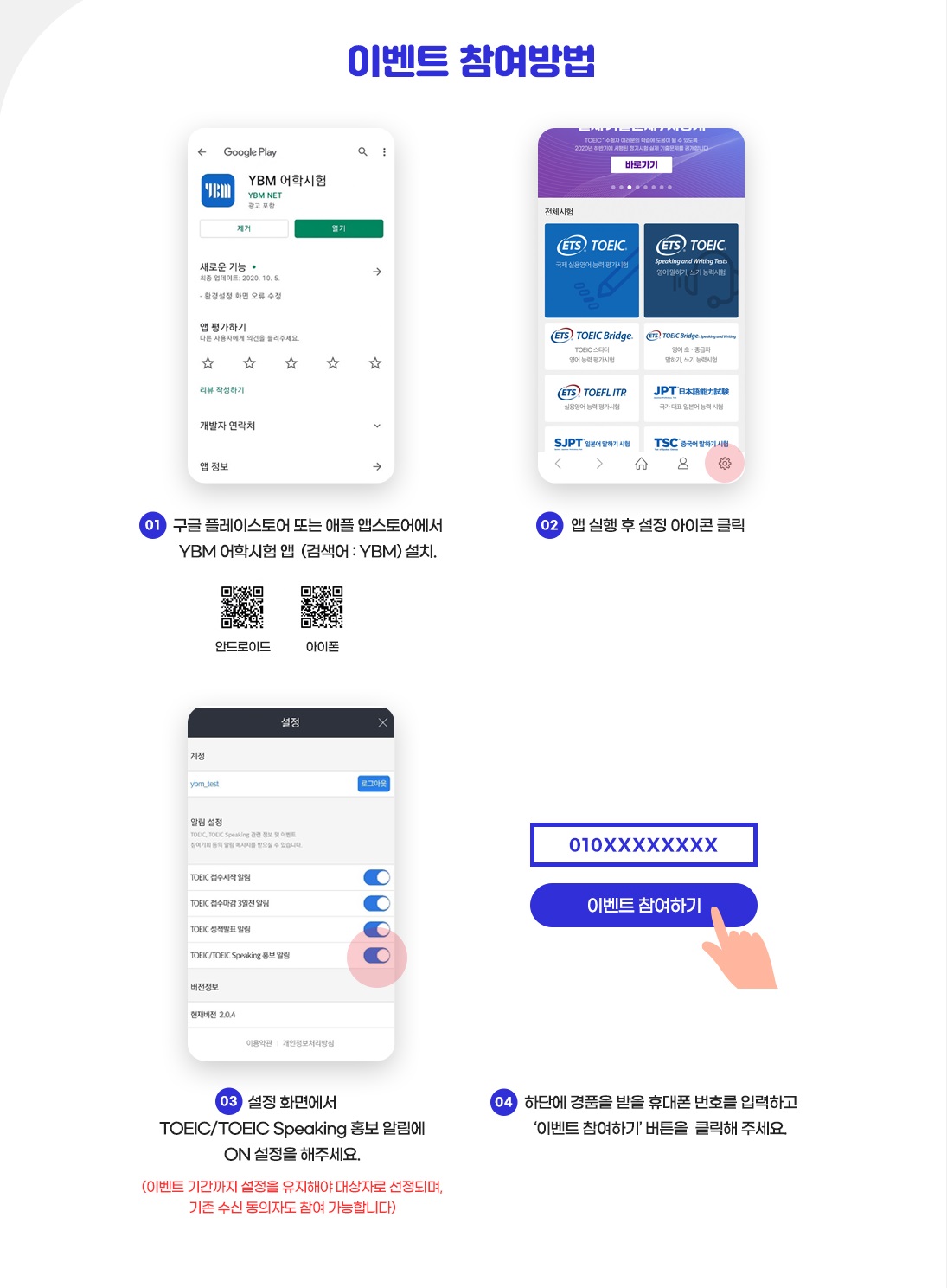여러분이 가장 궁금해할 정보, '경품'이 아닐까 싶은데요. ‘YBM 어학시험 APP’ 실행 후 우측 하단의 설정창에서 TOEIC/TOEIC Speaking 홍보 알림을 ON 설정한 후 이벤트에 참여하면 추첨을 통해 TOEIC, TOEIC Speaking 무료 응시권, 굽네치킨 세트, 스타벅스 아이스 카페라떼를 드립니다. 총 당첨 인원이 무려 140명에 달하는데요. 원하는 경품을 GET 할 수 있는 기회를 놓치지 마시고 꼭 참여해 보세요. 2021년 2월 4일(목) TOEIC Speaking 홈페이지에서 당첨자를 확인할 수 있습니다.