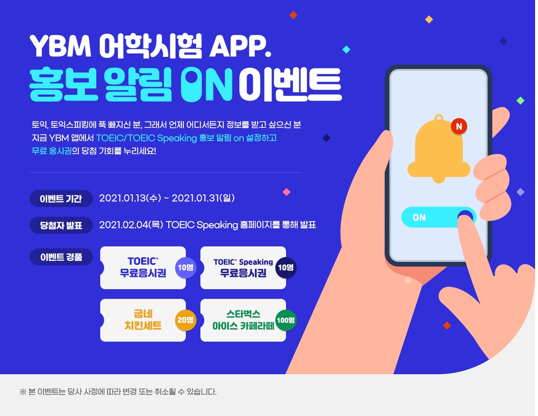 YBM 어학시험 APP 홍보 알림 'ON'이벤트가 1월 13일(수)부터 1월 31일(일)까지 시행됩니다. TOEIC, TOEIC Speaking을 준비하는 취업준비생, 대학생이라면 주목! 채용 정보, 최신 어학 시험 정보를 알려주는 앱이 있다는 사실, 알고 계셨나요? 바로 'YBM 어학시험 APP'입니다. 'YBM 모바일앱'의 홍보 알림을 'ON'을 설정하면 각종 소식을 빠르게 확인할 수 있는데요. 아직 'YBM 어학시험 APP'을 받지 않으셨거나 받았는데 홍보 알림을 켜놓지 않았다면? 지금이 기회입니다. <홍보 알림 ON이벤트>에 참여해 최신 소식과 경품을 동시에 받아 보세요!