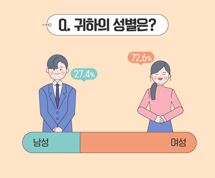 설문 참여자의 성비는 ‘남성’이 27.4%, ‘여성’이 72.6% 였습니다.