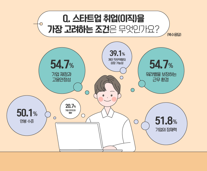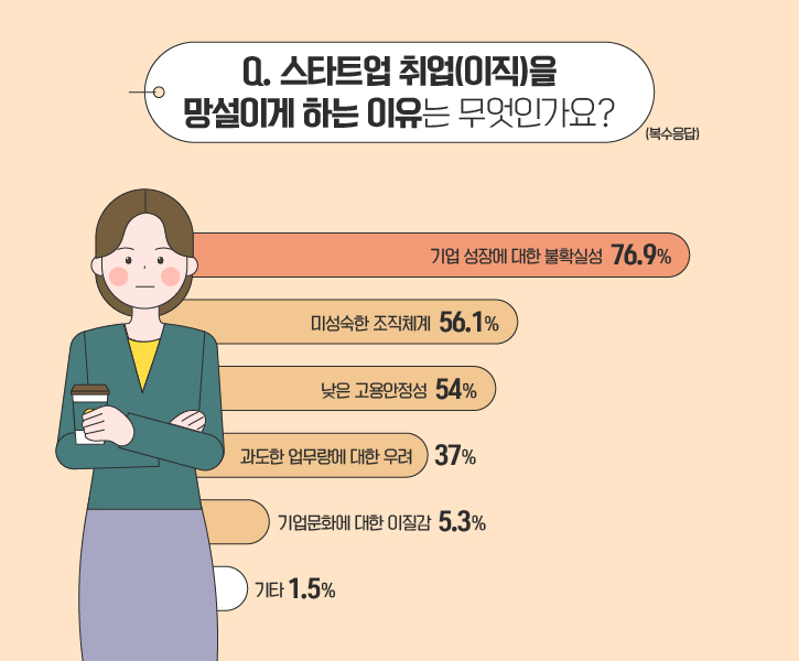 반면 스타트업 취업(이직)을 망설이는 분들은 그 이유가 무엇일까요? 설문에 참여한 열 명 중 일곱 명 이상이 ‘기업 성장에 대한 불확실성(76.9%)’을 꼽았습니다. 뒤이어 ‘미성숙한 조직체계(56.1%)’와 ‘낮은 고용안정성(54%)’, ‘과도한 업무량에 대한 우려(37%)’ 를 염려하고 있는 것으로 조사됐습니다. 또한 응답자의 5.3%는 ‘기업문화에 대한 이질감’을 걱정했으며, 기타 의견으로 ‘낮은 임금’, ‘대기업에 비해 부족한 복지 정책’ 등이 있었습니다.