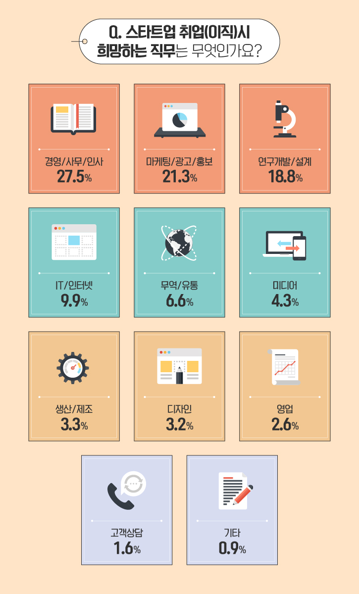 스타트업 취업(이직)시 희망하는 직무에 대해서도 질문을 드렸는데요. ‘경영/사무인사’ 직무를 희망하는 답변이 27.5%로 가장 많았습니다. 이어서 ‘마케팅/광고/홍보’ 직무가 21.3%의 응답률을 기록했고, ‘연구개발/설계(18.8%),’ ‘IT/인터넷(9.9%)’, ‘무역/유통(6.6%)’, ‘미디어(4.3%)’, ‘생산/제조(3.3%)’ 순으로 조사됐습니다.