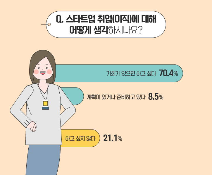 우선, 스타트업 취업(이직)에 대한 생각을 물어봤습니다. ‘기회가 있으면 하고 싶다’와 ‘계획이 있거나 준비하고 있다’라는 의견이 각각 70.4%와 8.5%를 기록해, 스타트업 취업(이직)을 긍정적으로 생각하는 응답자가 무려 78.9%를 차지했습니다. 반면, 설문에 참여한 21.1%는 ‘하고 싶지 않다’는 의견을 표했습니다.