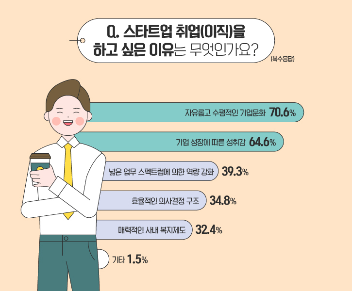 반면 스타트업 취업(이직)을 망설이는 분들은 그 이유가 무엇일까요? 설문에 참여한 열 명 중 일곱 명 이상이 ‘기업 성장에 대한 불확실성(76.9%)’을 꼽았습니다. 뒤이어 ‘미성숙한 조직체계(56.1%)’와 ‘낮은 고용안정성(54%)’, ‘과도한 업무량에 대한 우려(37%)’ 를 염려하고 있는 것으로 조사됐습니다. 또한 응답자의 5.3%는 ‘기업문화에 대한 이질감’을 걱정했으며, 기타 의견으로 ‘낮은 임금’, ‘대기업에 비해 부족한 복지 정책’ 등이 있었습니다.