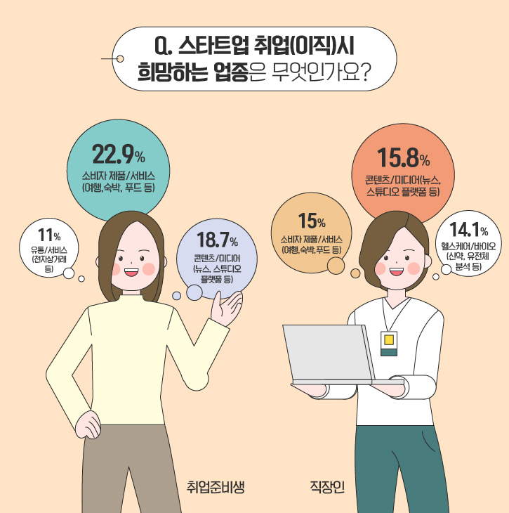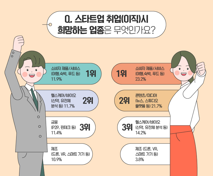 스타트업 취업(이직)시 희망하는 업종에 대한 선호도는 성별 및 직업에 따라 다소 차이를 보였습니다. 먼저 남성의 경우 ‘소비자 제품/서비스’, ‘헬스케어/바이오’, ‘금융’ 순으로 모두 11%대의 고른 응답률을 보였는데요. 반면, 여성들은 ‘소비자 제품/서비스(23.2%)’, ‘콘텐츠/미디어(21.7%)’, ‘헬스케어/바이오(14.2%)’ 순으로 업종별 선호도 차이가 비교적 명확하게 드러났습니다. 특히 ‘제조’ 업종에 대한 선호도는 남성 10.9%, 여성 3.8%으로 가장 큰 차이를 드러냈습니다.