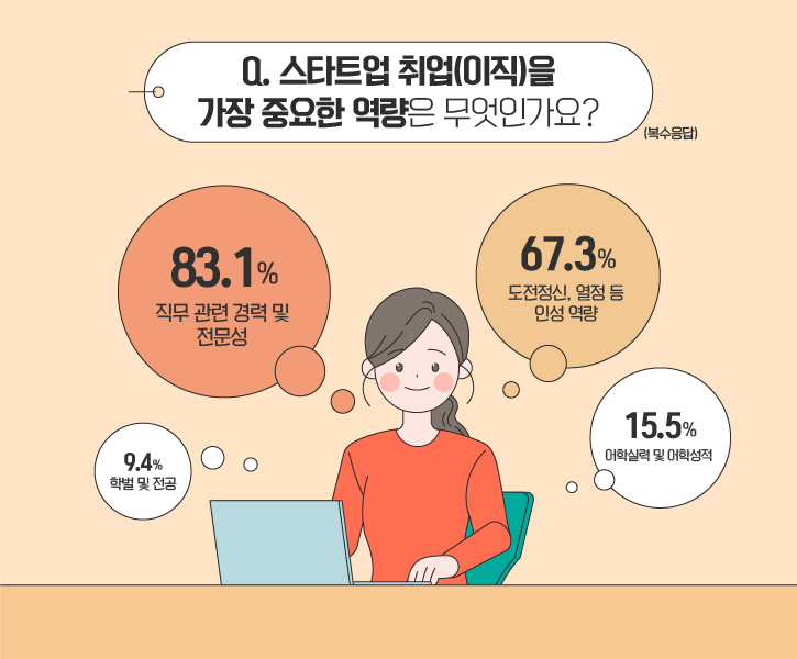 마지막으로, <토익스토리> 가족 여러분은 스타트업 취업(이직) 시 어떤 역량이 가장 중요하다고 생각했을까요? 조사에 참여한 83.1%가 ‘직무 관련 경력 및 전문성’을 꼽았습니다. 그리고 ‘도전정신, 열정 등 인성 역량’도 67.3%의 답변율을 기록, 응답자 세 명 중 두 명 이상의 선택을 받았네요. 또한 ‘어학실력 및 어학성적’이 15.5%, ‘학벌 및 전공’이 9.4%로 그 뒤를 이었습니다. ‘협업 능력’과 ‘커뮤니케이션 스킬’ 등의 역량이 필요하다는 의견도 확인할 수 있었습니다.