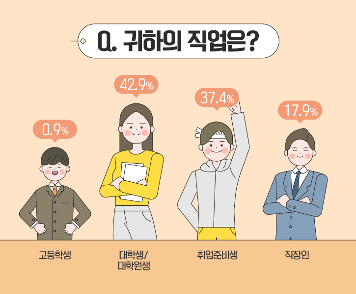 ‘스타트업 취업(이직)’을 주제로 한 설문이다보니 ‘대학생/대학원생’과 ‘취업준비생’ 분들이 각각 42.9%, 37.4%로 가장 많이 참여해주셨습니다. 뒤이어 참여자의 17.9%는 ‘직장인’이었고, 취업 전선에 뛰어들기 이른 나이인 ‘고등학생’도 응답자의 0.9%를 차지했네요.