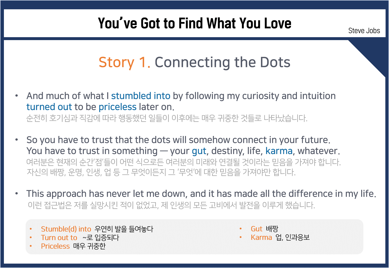 첫번째 이야기는 인생의 포인트가 되는 ‘점’들을 연결시키는 내용입니다. 하고 싶은 것을 함으로써 얻은 경험에 대한 이야기인데요. ‘Stumble into (우연히 발을 들여놓다)’라는 표현과 함께 ‘당시 순전히 호기심과 직관에 따라 우연치 않게 한 일들이 이후 돈으로도 살 수 없는 매우 귀중한 것들로 나타났다’는 메시지를 전했습니다. 그리고 ‘소화관’ 또는 ‘내장’을 의미하는 ‘gut’를 ‘배짱’이라는 뜻으로 사용했네요! 잡스는 자신의 매순간과 미래에 대한 믿음을 강조하며 함께 첫번째 이야기를 마쳤습니다.