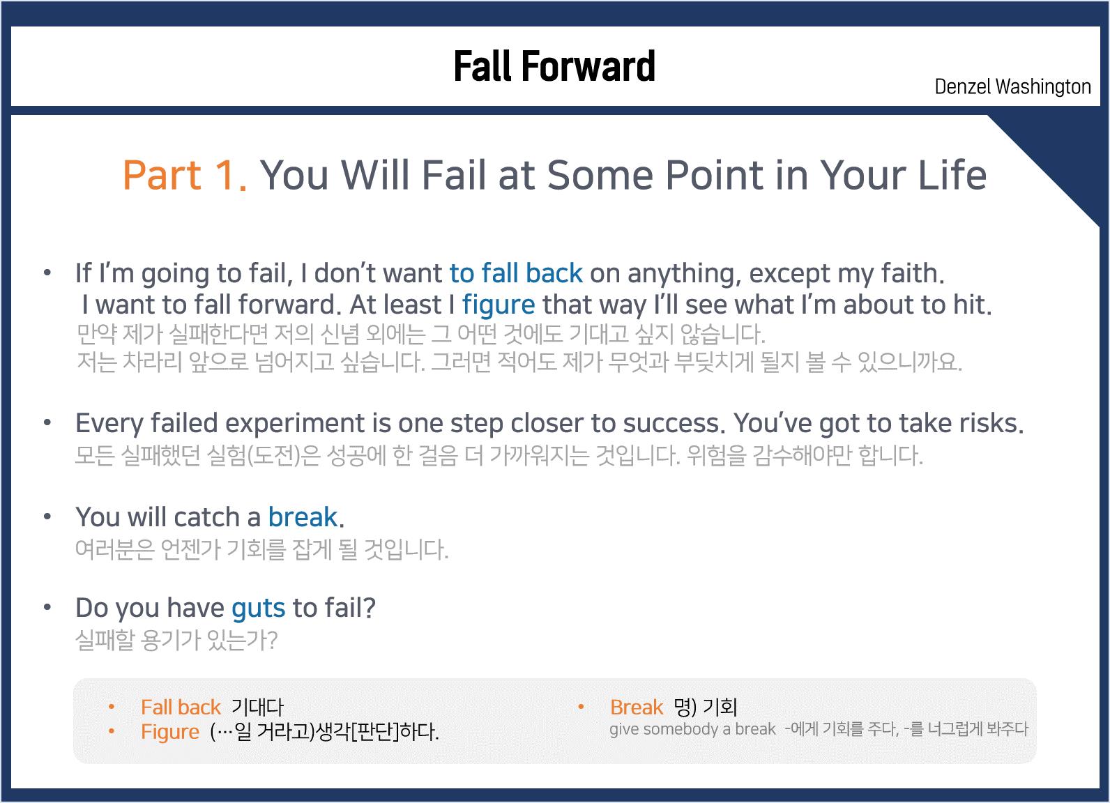 덴젤 워싱턴은 위험을 감수하지 않는다면 인생에서 가치 있는 것은 아무것도 없다는 것에 대한 중요성을 세가지 이유로 풀었습니다. 첫번째는 ‘인생의 어느 시점에 반드시 마주하게 될 실패’를 받아들이라는 점인데요. 이 부분에서 ‘figure’을 ‘수치’, ‘숫자’와 같은 명사가 아닌 ‘~일거라고 생각하다’라는 동사의 의미로도 확인할 수 있습니다. 덴젤 워싱턴 역시 ‘guts’를 ‘용기’, ‘배짱’의 의미로 ‘실패에 대한 용기’를 강조했네요!