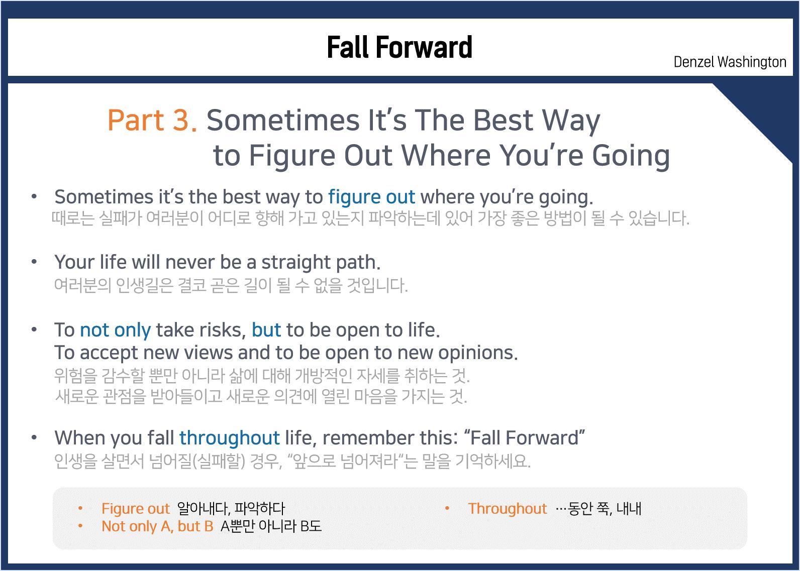 마지막으로 덴젤 워싱턴은 실패 또한 인생의 길잡이가 될 하나의 좋은 방법이 될 수 있다는 점을 설명했습니다. 여기서 ‘figure’은 Part 1.과 다르게 뒤에 ‘Out’을 붙여 하나의 숙어로 ‘알아내다, 파악하다’라는 의미입니다. 추가로 ‘인생길은 결코 곧은 길이 될 수 없다’는 현실적인 조언과 함께, 위험을 감수하고 새로운 관점과 의견에 개방적인 자세를 취하는 삶의 태도를 강조했습니다. 이처럼 ‘Not only A but B’를 활용하면 전하고자 하는 메시지를 병렬적으로 한 문장에 담아낼 수 있겠네요!