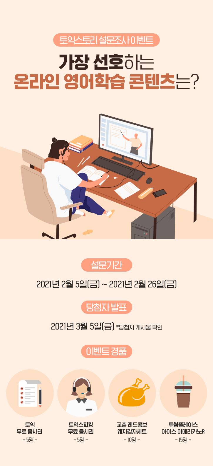 * 설문조사에 참여하면 추첨을 통해 '토익 무료 응시권'(5명), '토익스피킹 무료 응시권'(5명), '교촌 레드콤보 웨지감자세트'(10명), '투썸플레이스 아이스 아메리카노R'(15명)를 드립니다.