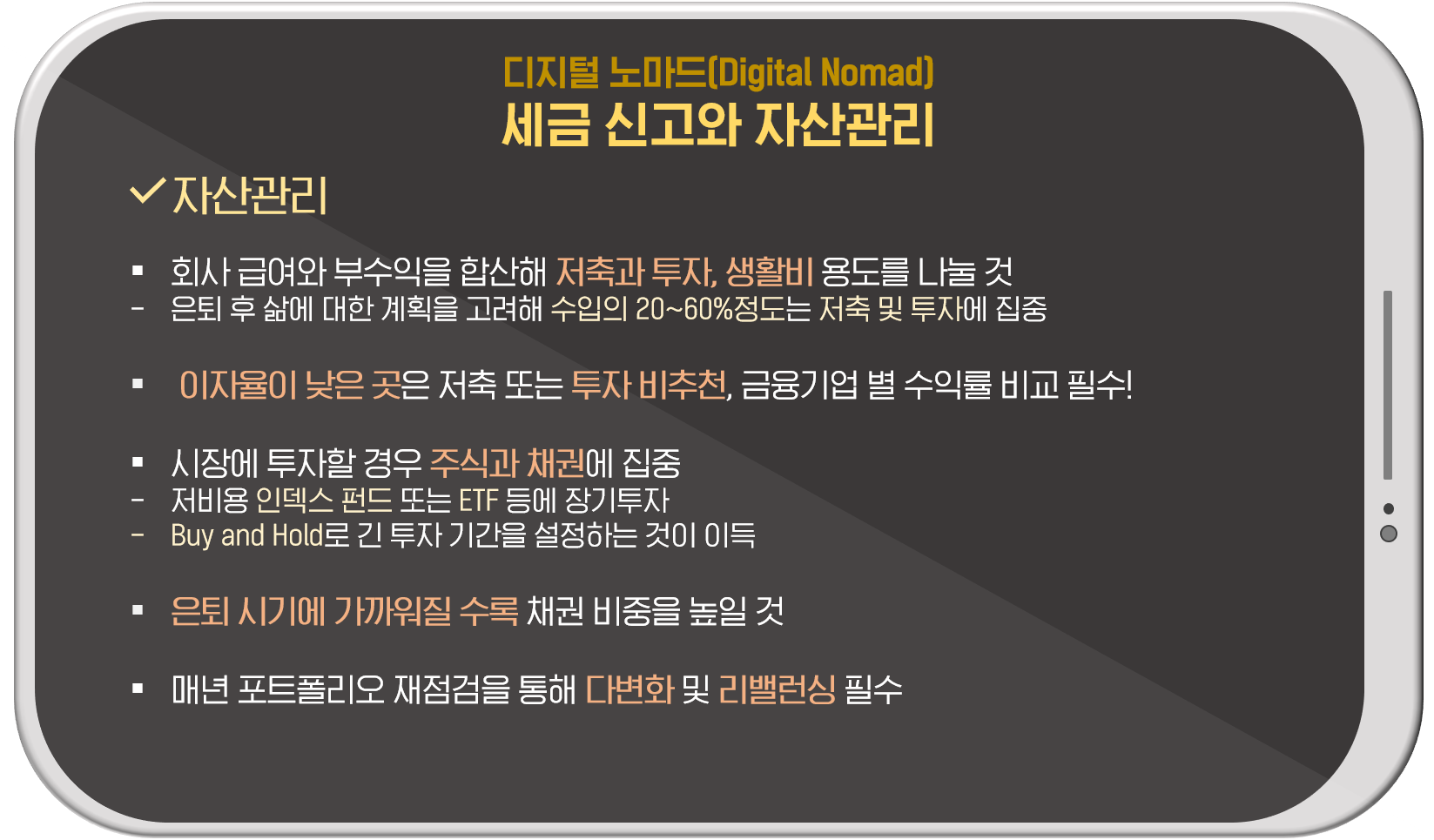 고정적인 회사 급여에 추가 수익을 위한 부업으로 디지털 노마드의 삶을 선택한 만큼, 더욱 꼼꼼한 자산관리도 필요합니다. 저축과 투자, 생활비 등 수익의 용도를 분할해 관리하는 것이 좋습니다. 또 수입의 20~60%정도를 저축 및 투자에 집중하도록 유지하며, 수익률이 높은 곳을 찾는 것이 중요합니다. 노후대비를 위한 저축 목적일 경우, 투자기간을 길게 설정하는 것이 훨씬 이득이라고 하니 기간도 반드시 체크해주세요!