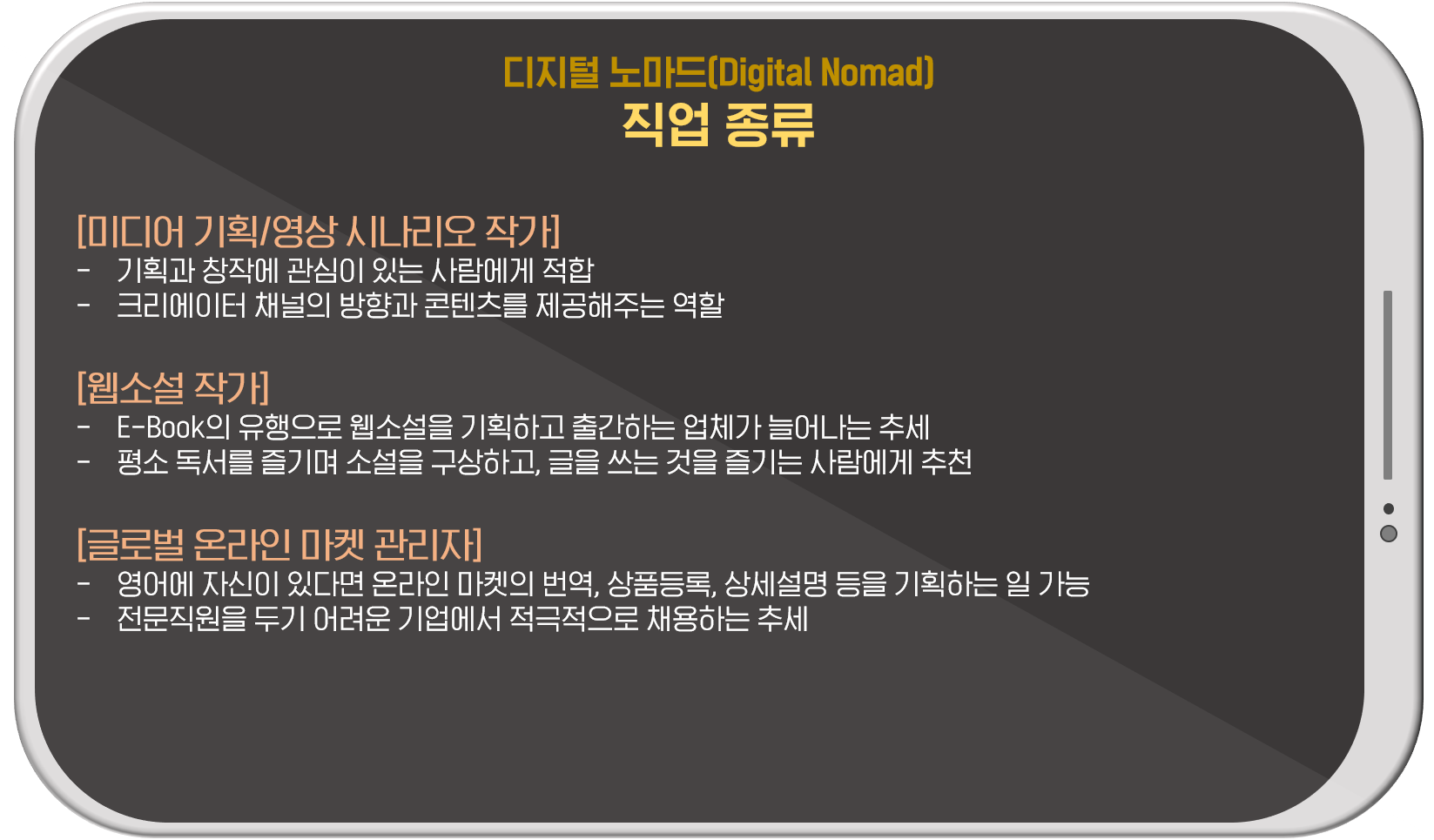 미디어 기획이나 영상 시나리오 작가를 통해 일상생활에서 얻은 소스와 영감을 표현할 수 있습니다. 다양한 곳에서 자유롭게 근무할 수 있는 디지털노마드의 장점을 살려 풍부한 기획을 할 수 있겠네요! 최근 어플리케이션으로도 즐기는 오디오북, e북 등을 통해 웹소설 작가로도 활동할 수 있습니다. 또, 영어를 포함해 외국어에 자신 있다면 개인 브랜드 또는 소규모 기업 온라인 마켓의 해외 진출을 위해 번역과 해외마케팅을 도울 수도 있답니다.