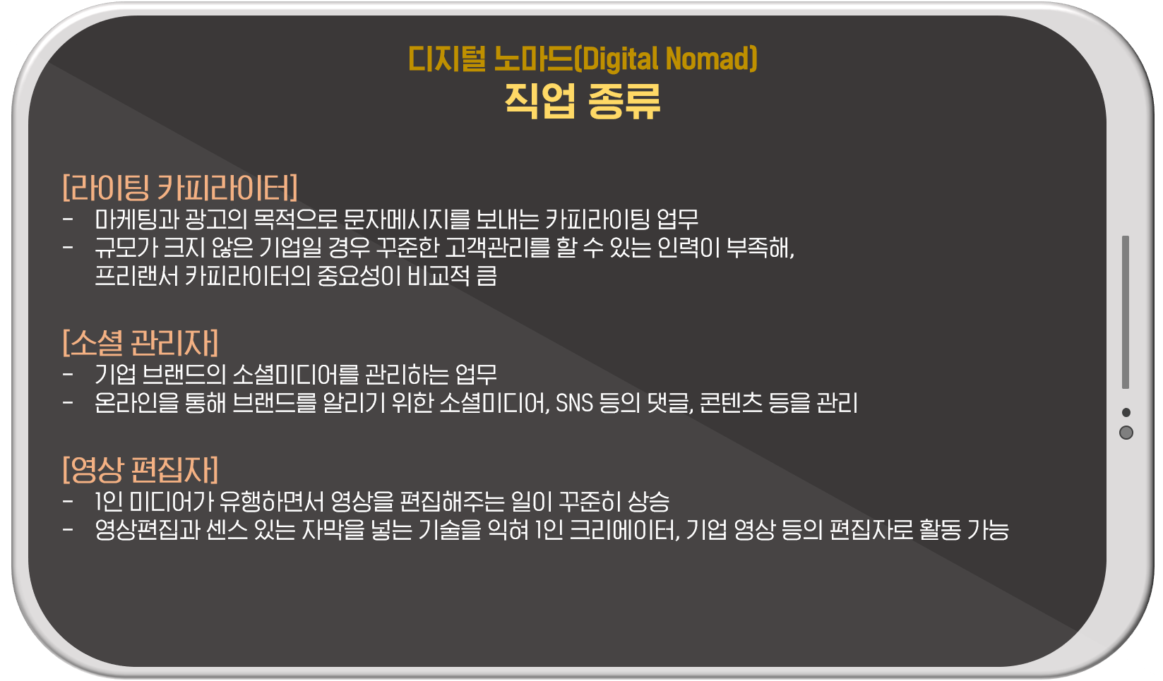 브랜드를 알리고 상품을 광고하는 문자를 보내는 카피라이터는 누구나 인터넷만 연결되어 있으면 할 수 있는 직업입니다. 꾸준한 수요를 유지할 수 있는 업무라는 점이 장점입니다! 또 인스타그램, 페이스북, 유튜브 등 각 기업에서도 소셜미디어 채널을 활용하고 있는데요. 소셜 채널을 전문적으로 관리하는 일을 통해 디지털 노마드가 될 수 있겠네요! 또, 1인 미디어와 크리에이터가 증가하면서 편집자에 대한 수요도 함께 커지고 있다고 하니 전문 프로그램을 익혀 재미있는 편집 센스를 발휘하는 것은 어떨까요? :)