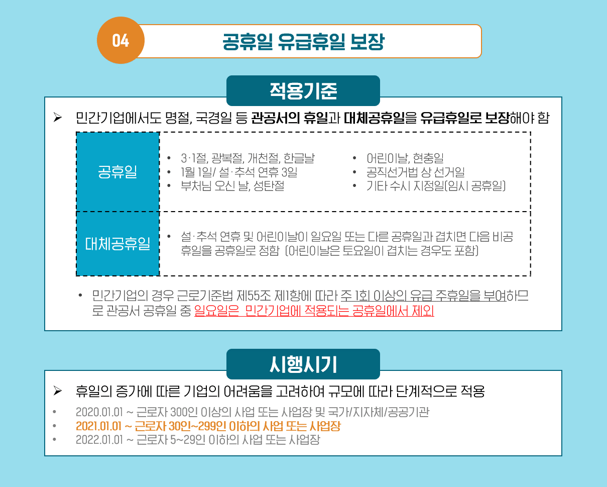 2021년 근로기준법에 의하면 ‘빨간 날’ 즉, 관공서 공휴일에 대한 유급휴일 보장 사업장이 확대됐는데요! 지난 해에는 300인 이상의 사업장, 국가/지방자치단체에서 공휴일에 대한 유급휴일이 적용되었지만, 2021년 1월 1일부터 30인~299인 사업장으로 대상이 확대되었습니다. 또한, 2022년에는 5~29인 사업장도 시행됩니다.